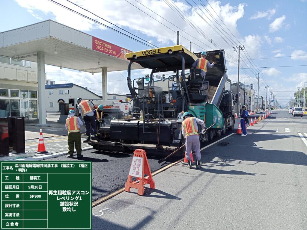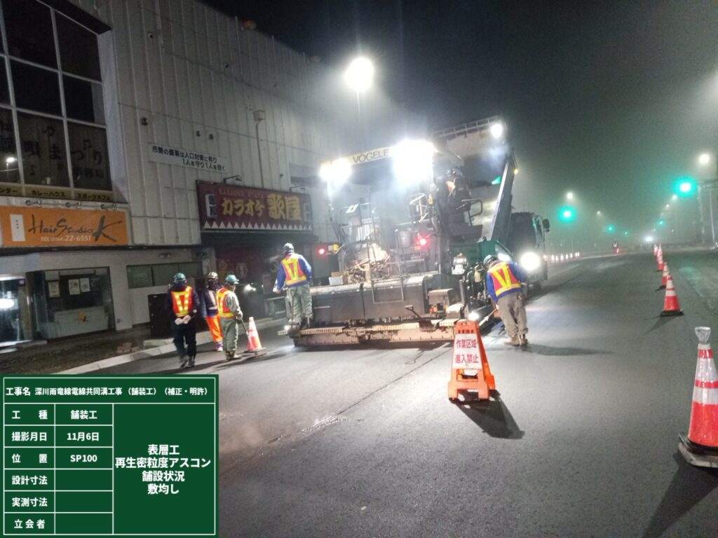 終盤には施工区間が重なり、昼は改良業者、夜は舗装業者といったように日々工程調整をし各社連携を取ることにより、降雪前に工期を終了することが出来ました。