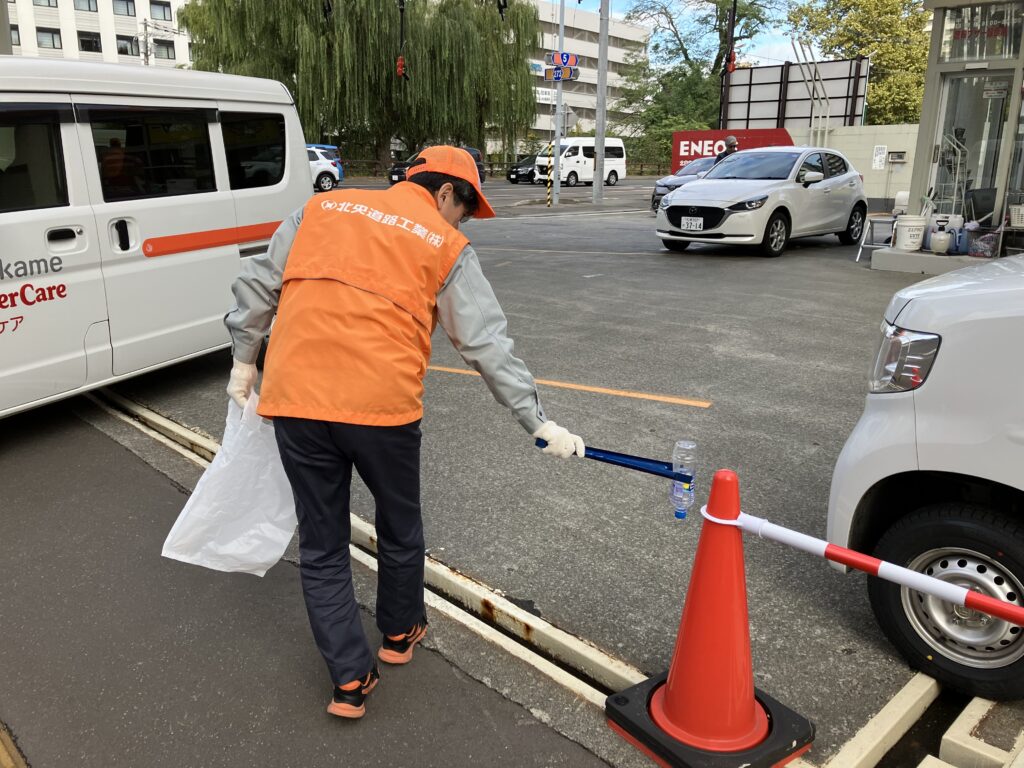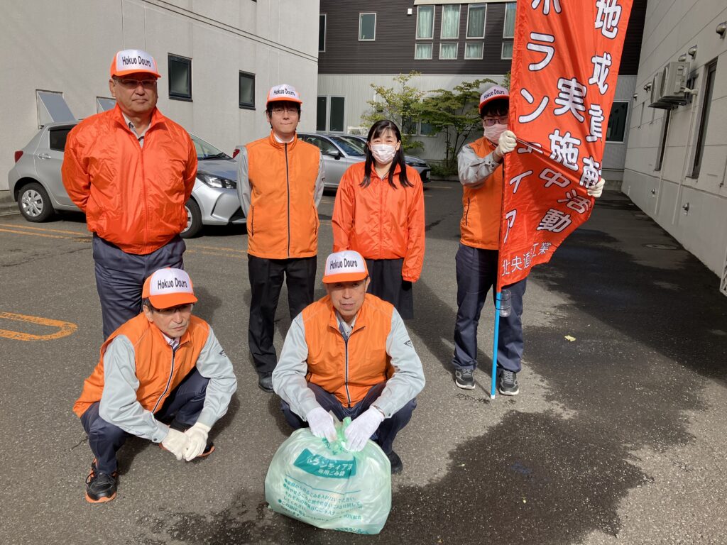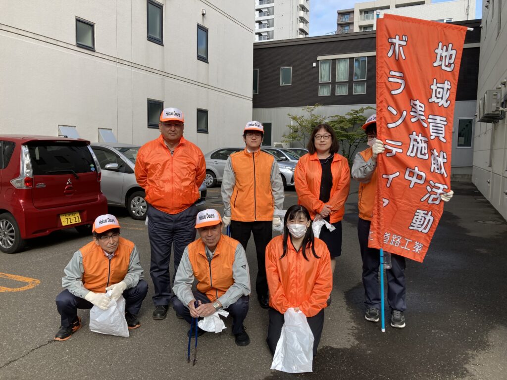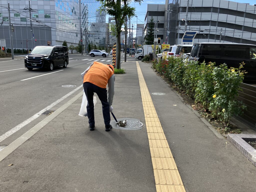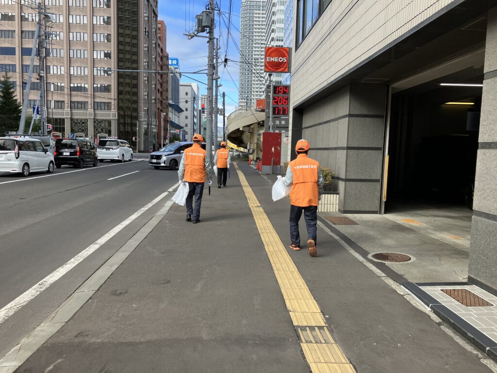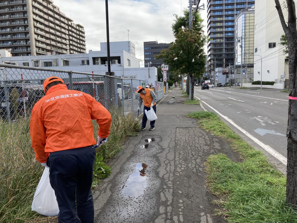 令和7年10月9日(木)午前9時から、本社周辺の歩道で今年度7回目の札幌市東区まち美化プログラムの活動を行いました。天気は晴れで気温は11℃。気温がめっきり低くなりましたが、7人が参加して作業を行いました。今回もタバコの吸い殻などの細かいゴミが多く40Lのゴミ袋が3/4ほどの量でした。