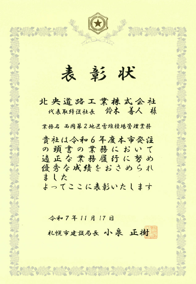 弊社は「西岡第2地区雪堆積場管理業務」において履行成績が優秀であると認められ、札幌市建設局長 小泉正樹様より「状況に応じた柔軟な対応を行い、昼夜を問わず強い使命感を持って尽力されました」とのお言葉をいただき、表彰状を授与していただきました。